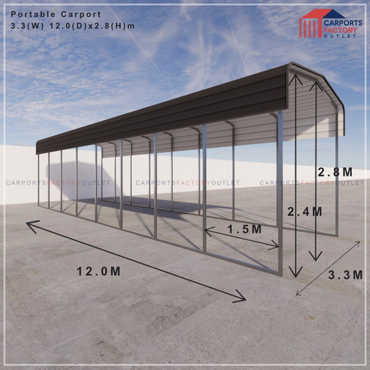 Portable Carport 3.3(W)x12.0(D)x2.8(H)m Wrapped Roof